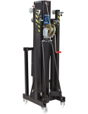 The FMT 800 lifting tower has a structural steel base and 6082-T6 aluminium alloy sections. Designed to lift heavy loads off the ground and hold them at high altitude. This lifting tower is easy to handle, has 4 swivel castors on the base and can pass through a door. Equipped with powerful stabilisers to level the lift on difficult terrain with a slight slope. Finished in black, with epoxy powder coating for extra strength. Equipped with two adjustable steel forks to support the load, whether placed on top or hooked underneath. Fitted with the safety system that engages in the more than unlikely event of a cable break.