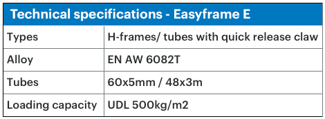 The H-frames can be equipped with built-in adjustable feet or can be used in combination with a scaffolding spindle.