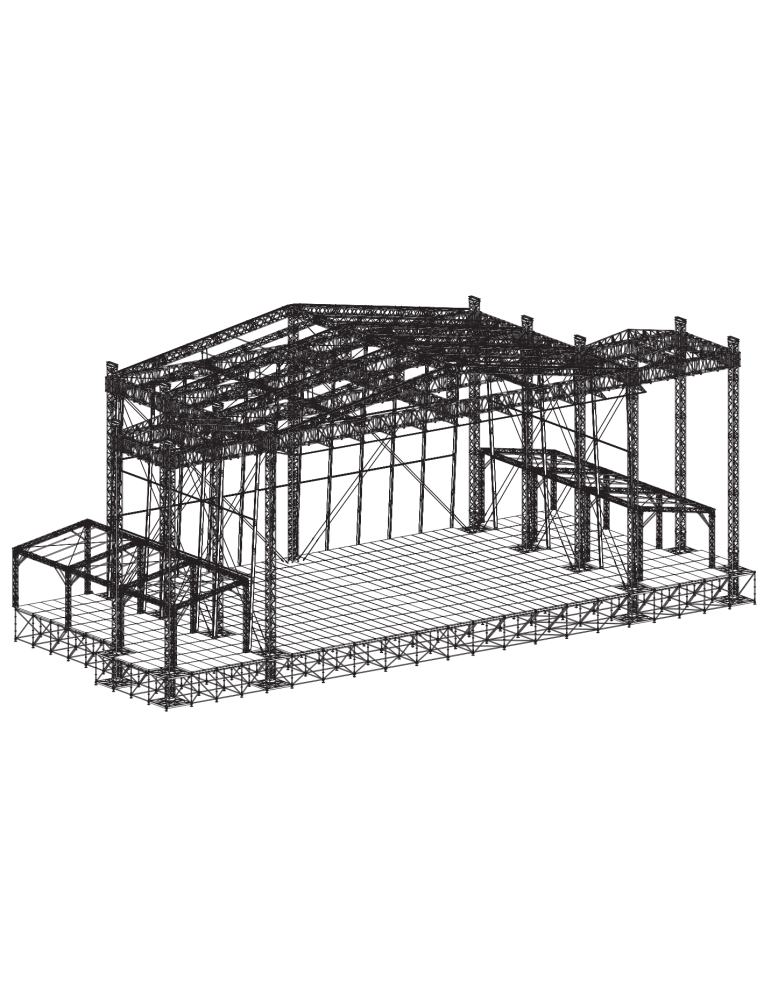 De plus, la construction comporte une zone de scène latérale couverte sur les deux côtés. Dans des conditions normales, cette structure pourrait être construite en 3 à 4 jours avec un équipage expérimenté d'env. 20 techniciens.