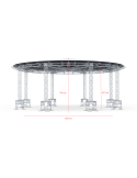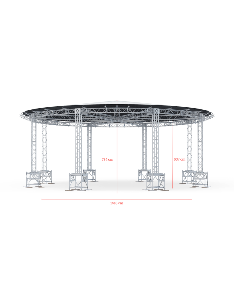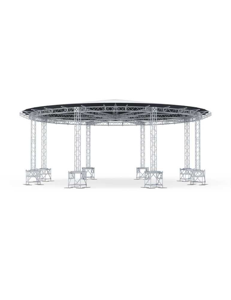 Le toit circulaire est un système de toit de forme circulaire basé sur la série de fermes polyvalentes. Sa forme typique donne une nouvelle dimension et de nouvelles possibilités à votre événement. La structure est entièrement conçue à partir de la série de fermes H40V (40 cm de côté). Toutes les longueurs sont des modules de fermes disponibles en standard et les caissons à haute résistance (BOX-40V-HD-0) optimisent la solidité du toit.