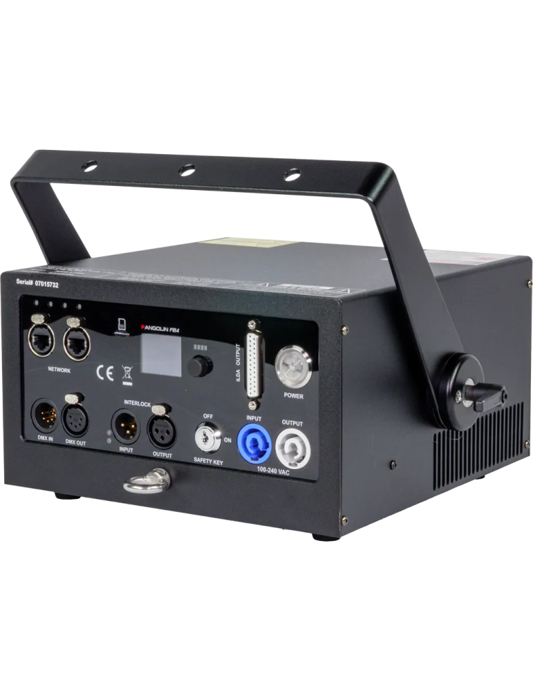 | Caractéristiques du système : | Tous les ajustements, tels que la puissance de sortie de chaque couleur, l'inversion des axes X et Y, la taille et la position X et Y, la sécurité, etc., sont gérés numériquement par le système de contrôle FB4. Ethernet in, power in/out, DMX in/out, Estop in/out, ILDA out. |