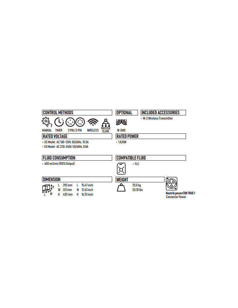 La M‑9 RGBAW est le simulateur d’effet CO₂ le plus avancé chez Antari. Elle utilise un bloc chauffant haute pression spécialement conçu et breveté, ce qui permet de générer un jet de fumée atteignant 10 mètres de hauteur sans avoir à utiliser des réservoirs de CO₂ dangereux ou encombrants.