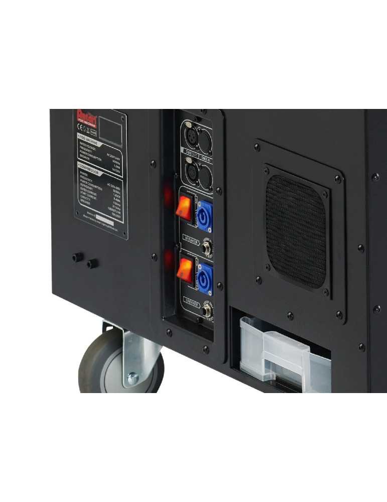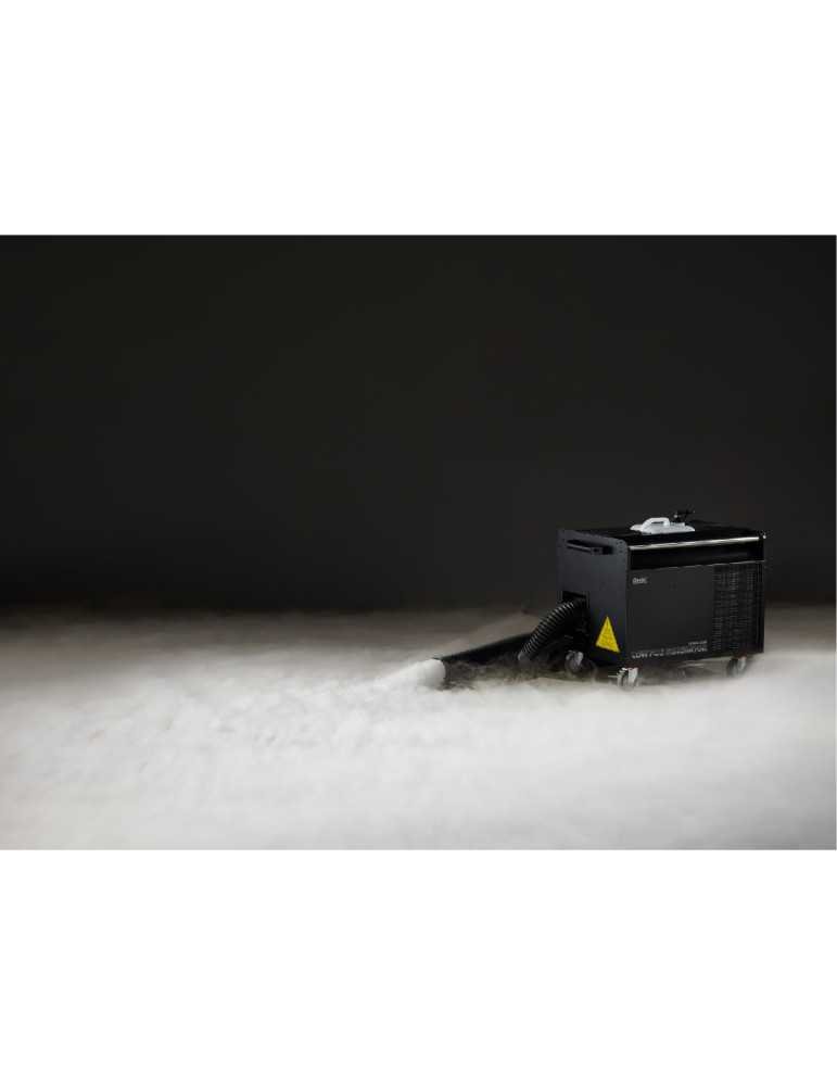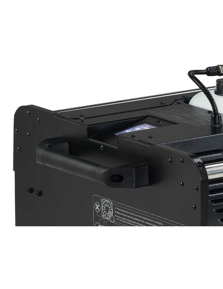 Le volume intégré, la minuterie et les réglages de la fonction DMX sont entièrement accessibles via son interface de contrôle d'affichage à cristaux liquides. L'unité est livrée avec un tuyau conducteur de 3 mètres permettant à l'utilisateur de guider le brouillard vers l'emplacement souhaité.