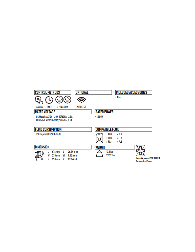 | Fluide compatible | Fluide de brouillard lourd Antari FLG, Fluide de brouillard léger Antari FLR Fluide de brouillard Antari FLY, fluide à effets de phase Antari FLZ, temps de suspension long |