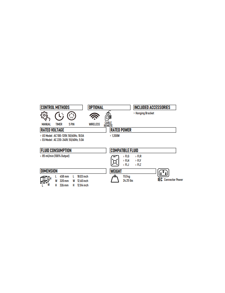 Puissance nominale de 1 200 W, générant une fumée dense à un rythme de 85 ml/min pour une couverture visuelle efficace en peu de temps.