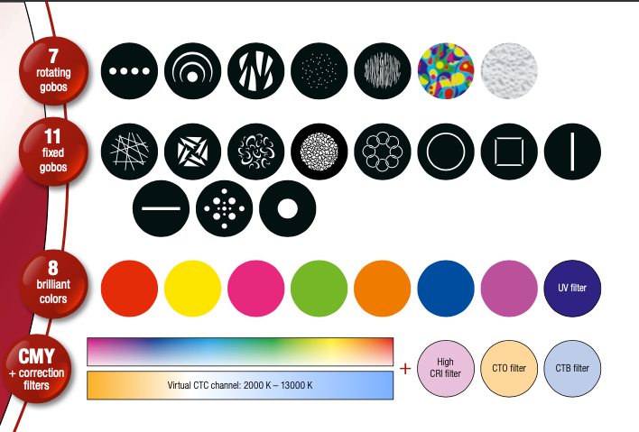- 1 roue de gobos avec 11 gobos statiques