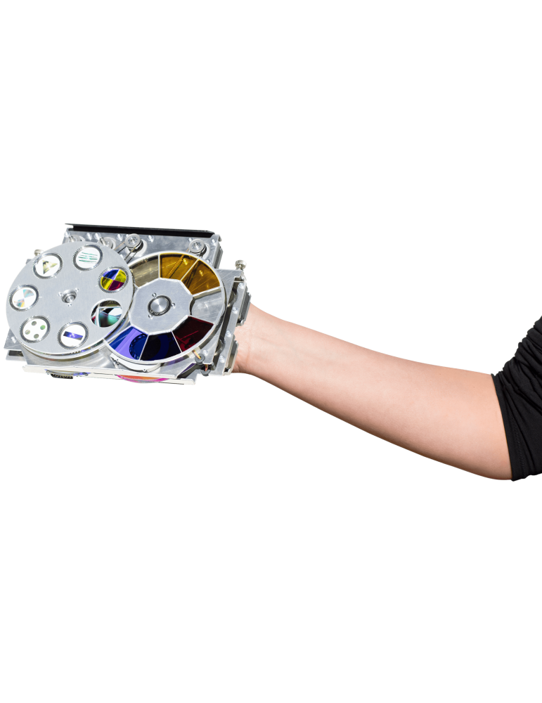 1 roue de gobos avec 6 gobos rotatifs, à positionnement et échangeables : 5 gobos + gobo multicolore + ouvert