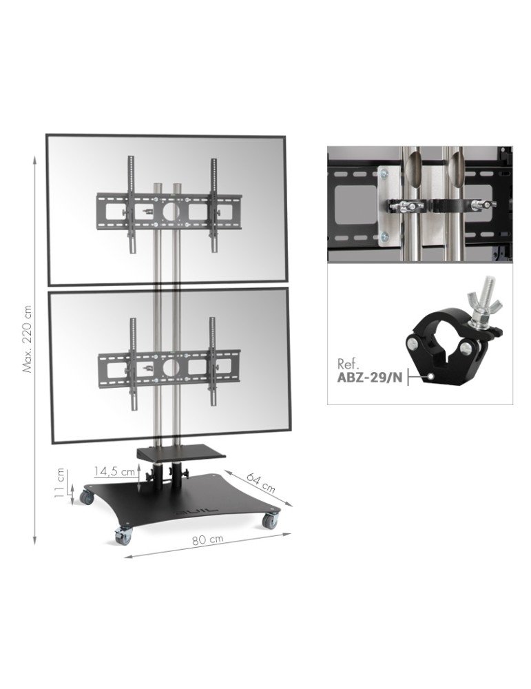 Support mobile professionnel pour placer 2 écrans de 32 à 65 pouces. Compatible avec la norme VESA max 800 x 500 mm.