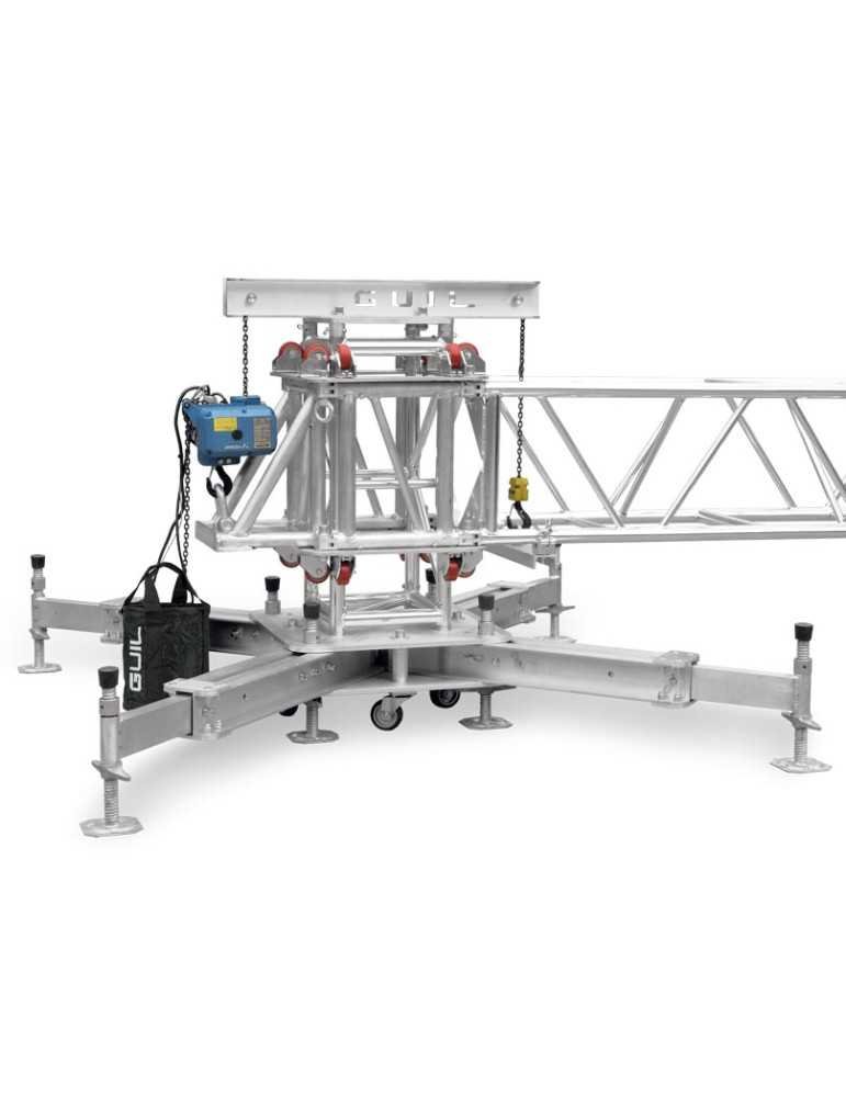 La tour est équipée d'un chariot élévateur à trois côtés (REF. CRR-548) en aluminium (Alliage : EN-AW 6082 T6) qui intègre l'adaptateur pour placer le palan électrique. La filière est équipée de seize rouleaux très résistants pour un coulissement parfait le long des sections du mât. La filière est conçue pour l'utilisation de fermes carrées de 520 x 520 mm (mesures standards). Remarque : pour d'autres mesures de fermes, consulter.